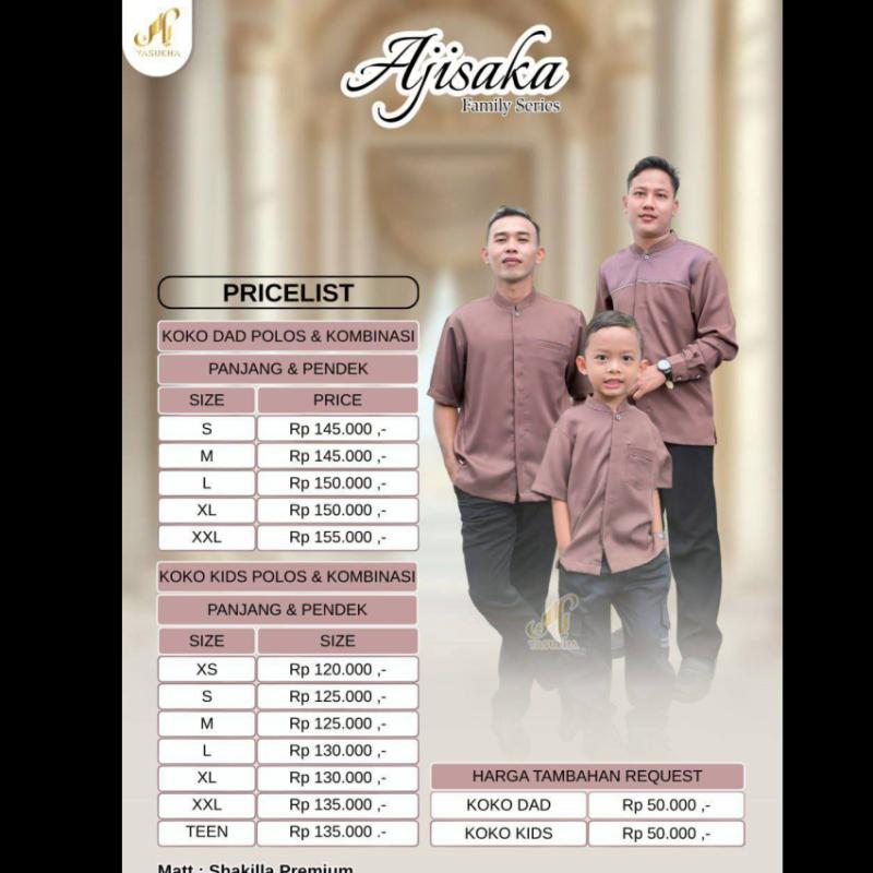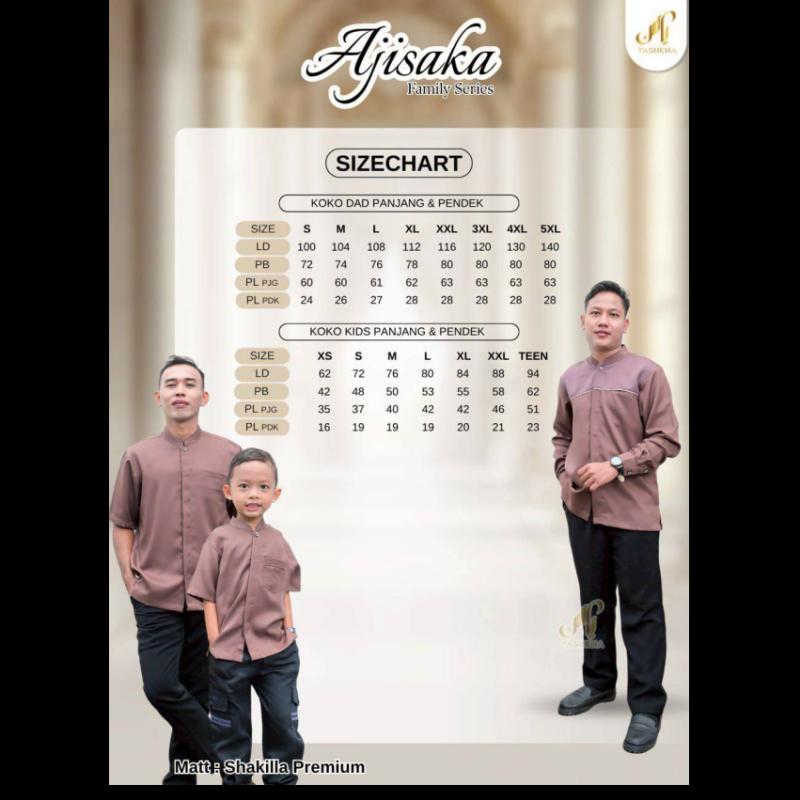 *TIMELINE* ?Ajisaka Family Series by @yasukha.pusat? ??Masa Promosi 15-29 November 2025 ?Setor list ke pusat max pukul 15.00 WIB 1 Desember2025 ?Validasi Data max pukul 10.00 WIB 2 Desember 2025 ?Konfirmasi DP 30% Wajib DP, jika tidak pesanan tidak dapat diproses 4 Desember 2025 ? Estimasi Ready Insha Allah *Pertengahan Februari 2026* ?Pelunasan pada saat barang sudah ready di pusat, kami akan memberi informasi satu minggu sebelum barang ready di pusat agar mitra dapat meneruskan informasi ke tim Bismillah… Open Pre Order New Katalog Family Series Ajisaka Family Series by @yasukha.pusat? Ajisaka Family Series by @yasukha.pusat diciptakan dengan nuansa estetika modern untuk menyempurnakan penampilan di momen penuh kehangatan bersama keluarga. Dirancang dengan perpaduan motif indah dan warna yang menawan, koleksi ini menghadirkan busana elegan nan memesona. Menggunakan Shakilla Premium sebagai bahan utama, serta dikombinasikan dengan Babydoll Motif Premium pada dress, menghasilkan kesan anggun pada keseluruhan tampilan. Untuk koleksi pria, Koko Polos dan Koko Kombinasi dihadirkan dengan Shakilla Premium sebagai bahan utama, dan dipadukan dengan Dobby pada varian Koko Kombinasi. Paduan ini menghadirkan tampilan minimalis nan menawan. Ajisaka Family Series tercipta dari perpaduan sempurna antara keindahan, kenyamanan, dan keharmonisan, menjadikannya pilihan istimewa untuk merayakan momen penuh kebersamaan? ??Detail : ?Dress Mom (Style 1) ? Matt : Shakilla Premium dengan kombinasi Babydoll Motif Premium ? Desain layer pada bagian lengan atas yang membuat tampilannya semakin menawan ? Menggunakan resleting pada bagian depan kanan dan kiri sehingga busui friendly ? Menggunakan kancing pada bagian belakang dressnya ? Terdapat saku multifungsi di bagian kanan dress ? Menggunakan manset kancing sehingga wudhu friendly ? Menggunakan aksen renda pada bagian manset ?Tunik Mom (Style 2) Top ? Matt : Shakilla Premium dengan kombinasi Babydoll Motif Premium ? Desain lengan puff dan aksen tali yang dapat distyling ? Terdapat resleting pada bagian depan sehingga busui friendly ? Desain kombinasi tumpuk layer yang menggunakan Babydoll Motif Premium pada bagian depan (hampir full) dan bagian belakang (hanya di bagian atas) ? Menggunakan manset kancing sehingga wudhu friendly Skirt ? Matt : Shakilla Premium dengan kombinasi Babydoll Motif Premium ? Menggunakan full karet pada bagian pinggang ? Terdapat saku multifungsi pada bagian kanan rok ? Kombinasi layer motif yang menggunakan Babydoll Motif Premium ?Detail Dress Kids ? Matt : Shakilla Premium dengan Kombinasi Babydoll Motif Premium ? Menggunakan desain kerah rebah dan terdapat resleting pada bagian belakang ? Menggunakan manset karet sehingga wudhu friendly ? Terdapat aksen renda pada bagian bawah layer dress yang mempercantik tampilan ? Kombinasi layer pada bagian depan yang menggunakan Babydoll Motif Premium ? Terdapat aksen renda pada bagian lengan ? Terdapat saku multifungsi pada sebelah kanan ?Koko Dad & Kids Polos Panjang & Pendek ? Matt : Shakilla Premium ? Menggunakan desain kerah shanghai yang membuat tampilannya semakin menawan ? Menggunakan full hidden kancing sehingga tampilannya semakin minimalis ? Terdapat saku pada sebelah kiri dan hidden saku untuk Koko dadnya ? Menggunakan lengan manset double kancing untuk lengan panjang ?Koko Dad & Kids Kombinasi Panjang & Pendek ? Matt : Shakilla Premium dengan Kombinasi Dobby ? Menggunakan desain kerah shanghai yang membuat tampilannya semakin menawan ? Menggunakan full hidden kancing sehingga tampilannya semakin minimalis ? Menggunakan hidden saku pada sebelah kiri ? Menggunakan lengan manset double kancing untuk lengan panjang ?Varian Warna Ajisaka Family Series : ? Black ? Powder Blue ? Slate Grey ? Saddle Brown ? Sizechart : ?Dress Mom (Style 1) - XS : LD 84 //PB 125 - S : LD 90 //PB 131 - M : LD 96 //PB 135 - L : LD 100 //PB 137 - XL : LD 110 //PB 140 - XXL : LD 120 //PB 142 - 3XL : LD 130 //PB 142 - 4XL : LD 140 //PB 142 - 5XL : LD 150 //PB 142 ?Tunik Mom (Style 2) - S : LD 90 //PB 67 - M : LD 96 //PB 67 - L : LD 100 //PB 67 - XL : LD 110 //PB 70 - XXL : LD 120 //PB 70 ?Skirt Mom - Standar : Lingkar Pinggang 78-100 // Panjang Skirt 94 - Jumbo : Lingkar Pinggang 84-120 // Panjang Skirt 100 ?Koko Dad Polos & Kombinasi Panjang & Pendek - S : LD 100 //PB 72 - M : LD 104 //PB 74 - L : LD 108 //PB 76 - XL : LD 112 //PB 78 - XXL : LD 116 //PB 80 - 3XL : LD 120 //PB 80 - 4XL : LD 130 //PB 80 - 5XL : LD 140 //PB 80