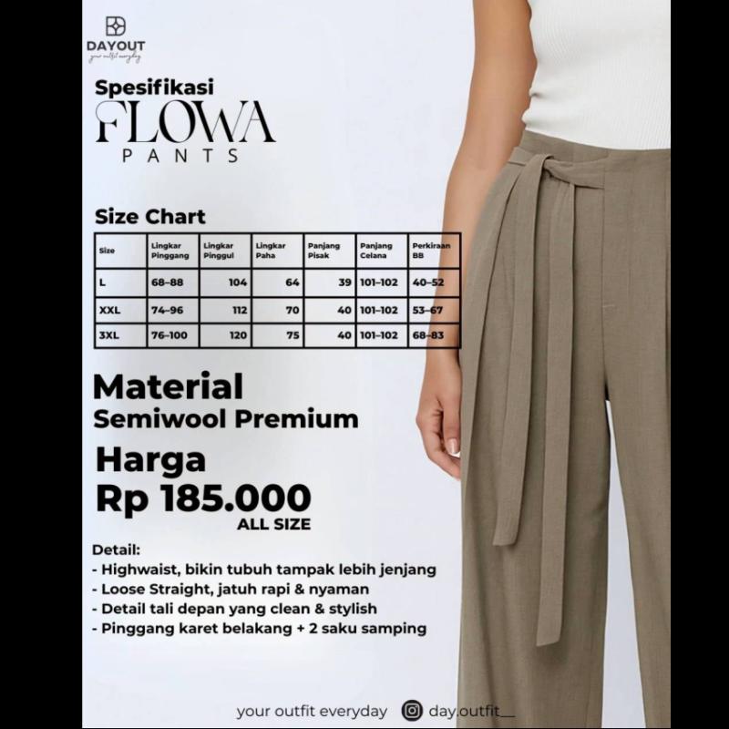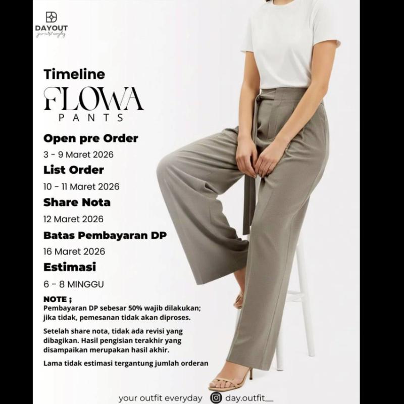 ?? OPEN PRE ORDER ?? ? FLOWA PANTS BATCH 2 ? 3 - 9 MARET 2026 by DAYOUT Kadang, outfit terbaik itu yang simpel tapi bikin percaya diri ? Flowa Pants by Dayout hadir dengan potongan highwaist dan siluet loose straight yang jatuh rapi, bikin tampilan terlihat lebih tinggi dan clean tanpa usaha berlebih.? Material Semiwool Premium terasa adem, lembut, dan nyaman dipakai seharian ?. Pas untuk kamu yang aktif tapi tetap ingin tampil rapi dan stylish?? ? Detail Flowa Pants yang bikin jatuh cinta: - Highwaist, bantu bentuk siluet lebih jenjang - Potongan longgar, nyaman & nggak gerah - Tali depan minimalis, look makin clean - Pinggang karet belakang, lebih fleksibel - 2 saku samping, fungsional untuk daily use - Tersedia ukuran L – 3XL ? Harga: Rp 185.000 (All Size) Mix & match dengan atasan apa pun, Flowa Pants siap menemani aktivitasmu setiap hari ? Karena nyaman itu penting, tapi tampil cantik juga nggak kalah penting ? Follow kami di ?? Instagram: @day.outfit__ Telegram: https://t.me/dayoutpusatofficial #flowapants #dayoutfit #celanawanita #celanahighwaist #celanaloose #celanakerja #outfitdaily #outfitwanita #ootdindonesia #fashionwanita #celananyaman #celanapremium #youroutfiteveryday Thank You and Happy Shopping ^_^??